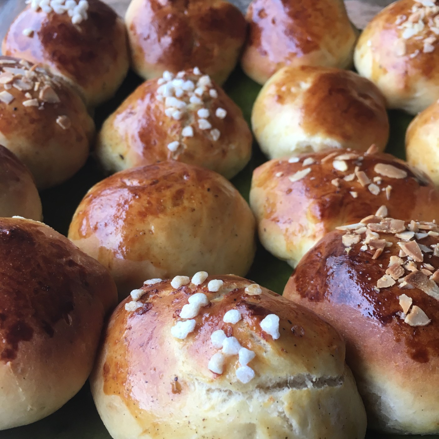 vous obtenez une grosse boule que vous allez couper et façonner en 15 petites boules d’environ 60 g chacune. Posez-les sur du papier sulfurisé ou une feuille de cuisson en silicone (plus pratique). Dans un petit récipient versez le jaune d’oeuf un peu de lait la vanille en poudre, mélangez et dorez les brioches au pinceau. Ajoutez sur le dessus quelques amandes effilées ou du sucre gros grain.
