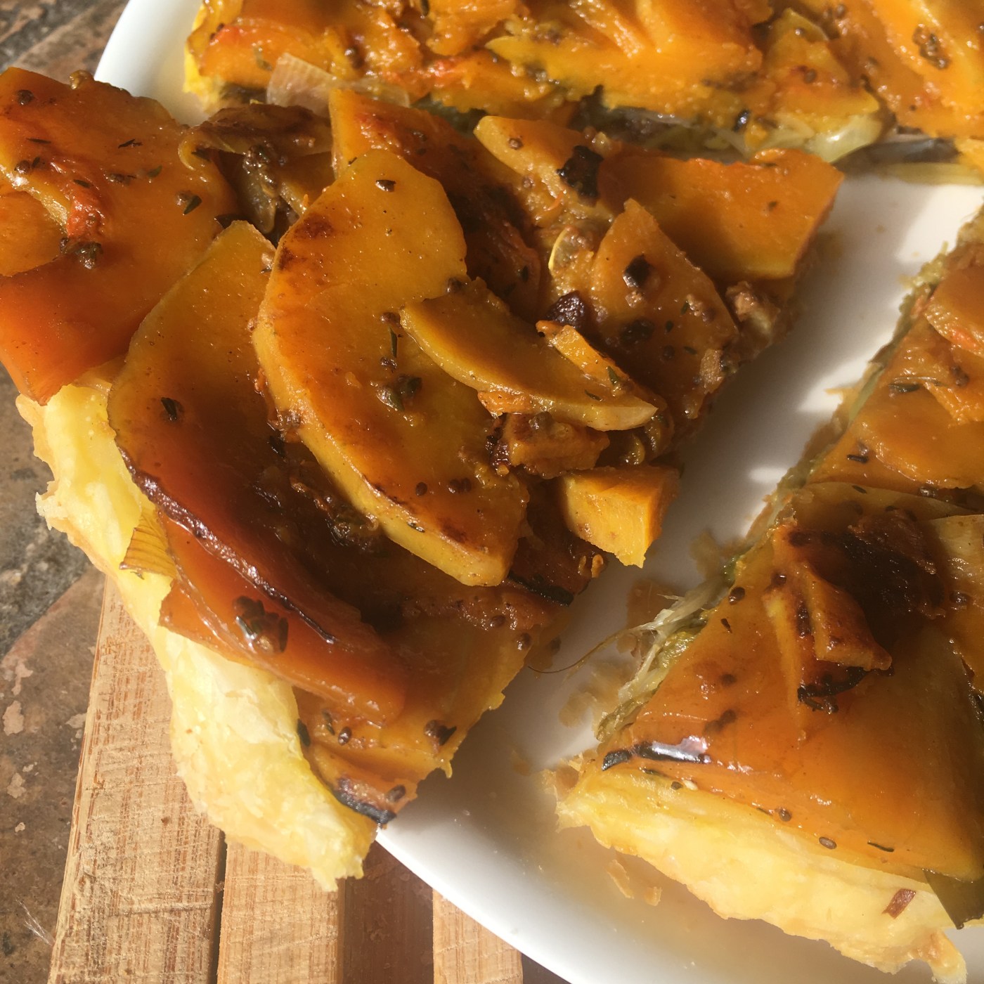Etalez la pâte feuilletée puis badigeonnez-la de tapenade ou moutarde ; posez-la sur les légumes et enfournez pour 30 mn à 180°C.