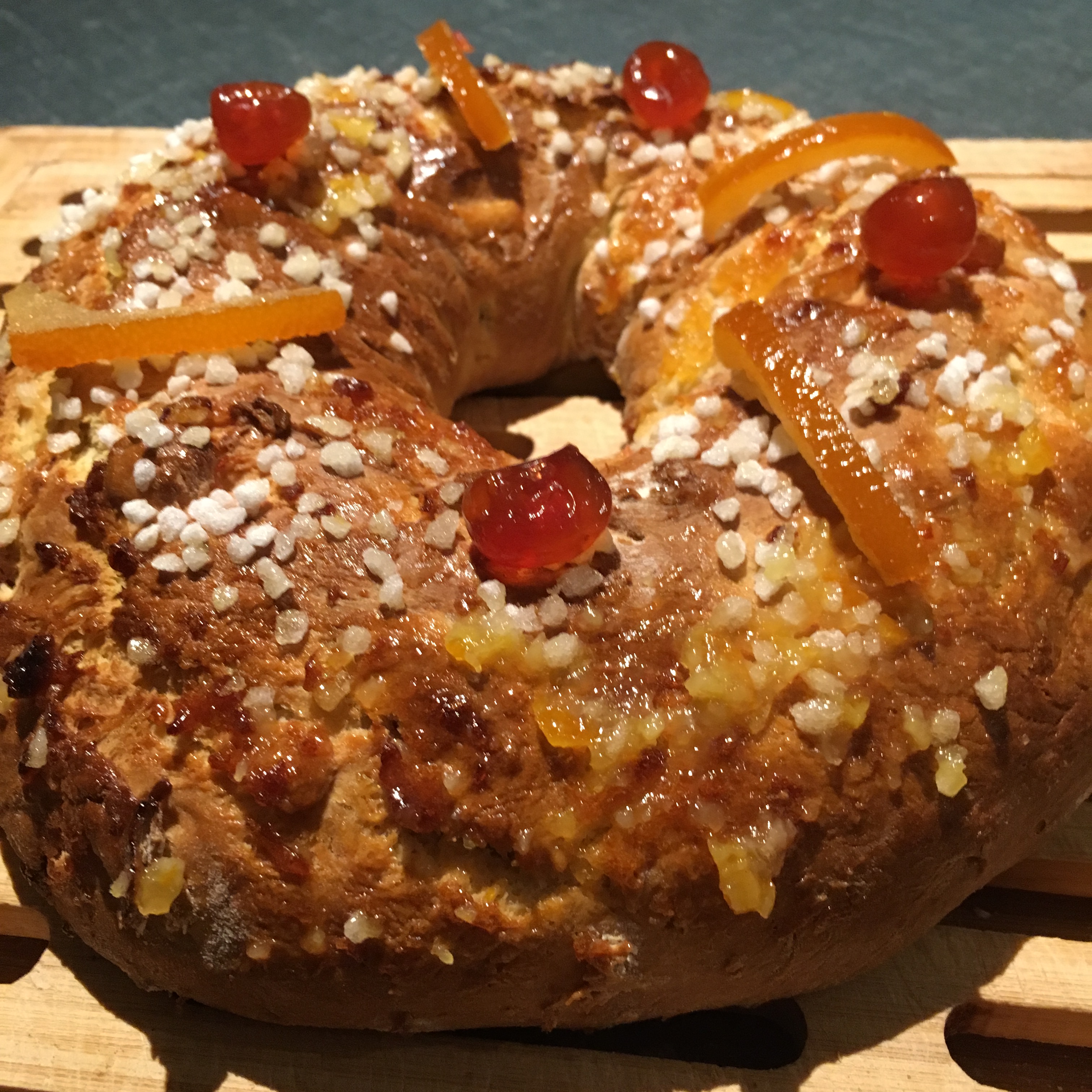 Sortez la pâte de la machine, formez une boule après avoir inséré 11 cerises confites, 11 lamelles d’oranges et le citron confit coupé en petits morceaux ainsi que la fève. Faites un trou au milieu car la brioche va gonfler et le trou rétrécir.