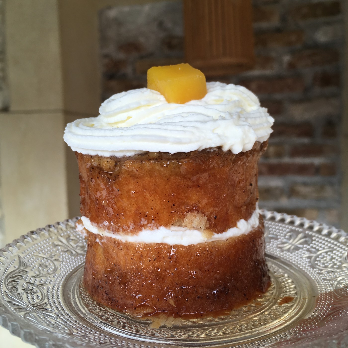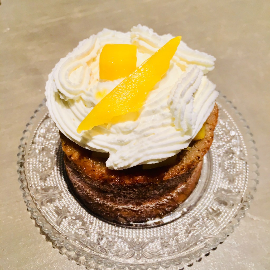Coupez vos babas dans l’épaisseur et ajoutez la crème chantilly sur les 2 morceaux. Décorez avec des morceaux de mangue.