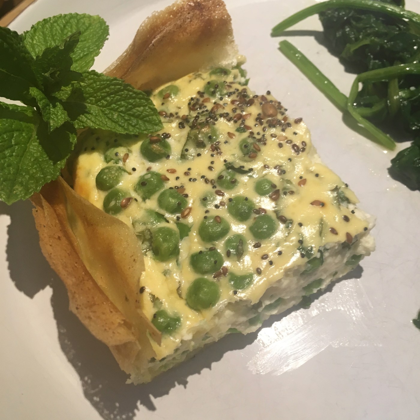Mélangez la ricotta, la crème de soja, les oeufs, le fromage râpé, la menthe ciselée, les petits pois. Salez, poivrez.