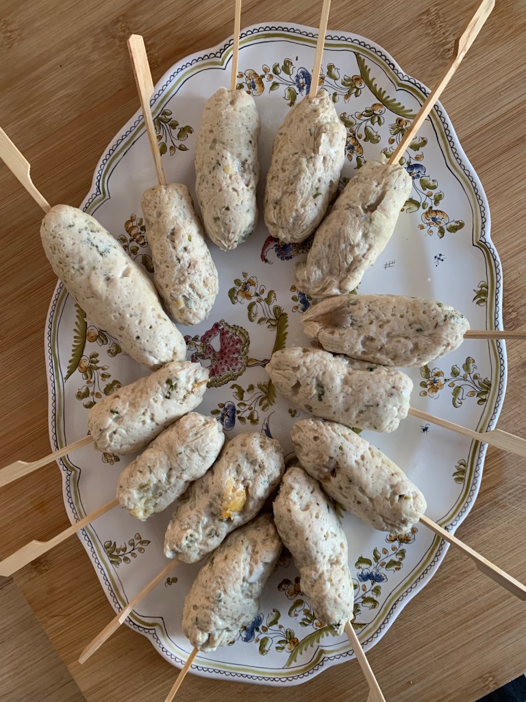 Façonnez des bâtonnets que vous enfermez dans du papier cello. Faites-les cuire dans une eau frémissante pendant 2 mn. Egouttez-les, enlevez le papier puis enfoncez une pique à brochettes.