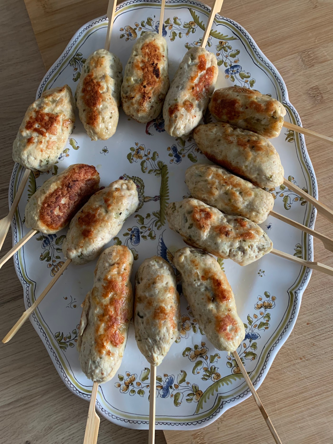 Façonnez des bâtonnets que vous enfermez dans du papier cello. Faites-les cuire dans une eau frémissante pendant 2 mn. Egouttez-les, enlevez le papier puis enfoncez une pique à brochettes.