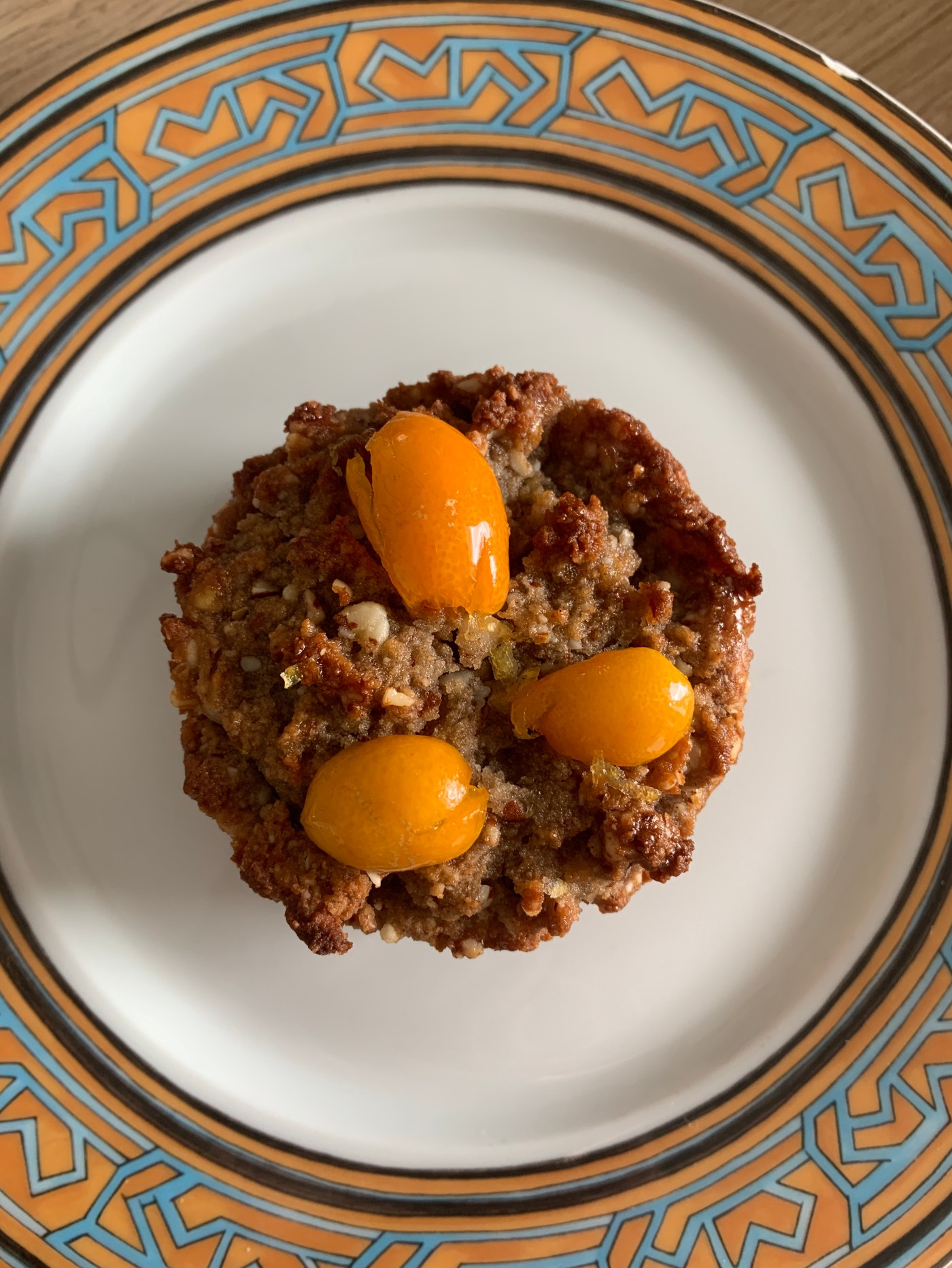 Déposez un financier dans chaque assiette, garnissez de kumquats et nappez le tout de sirop froid.