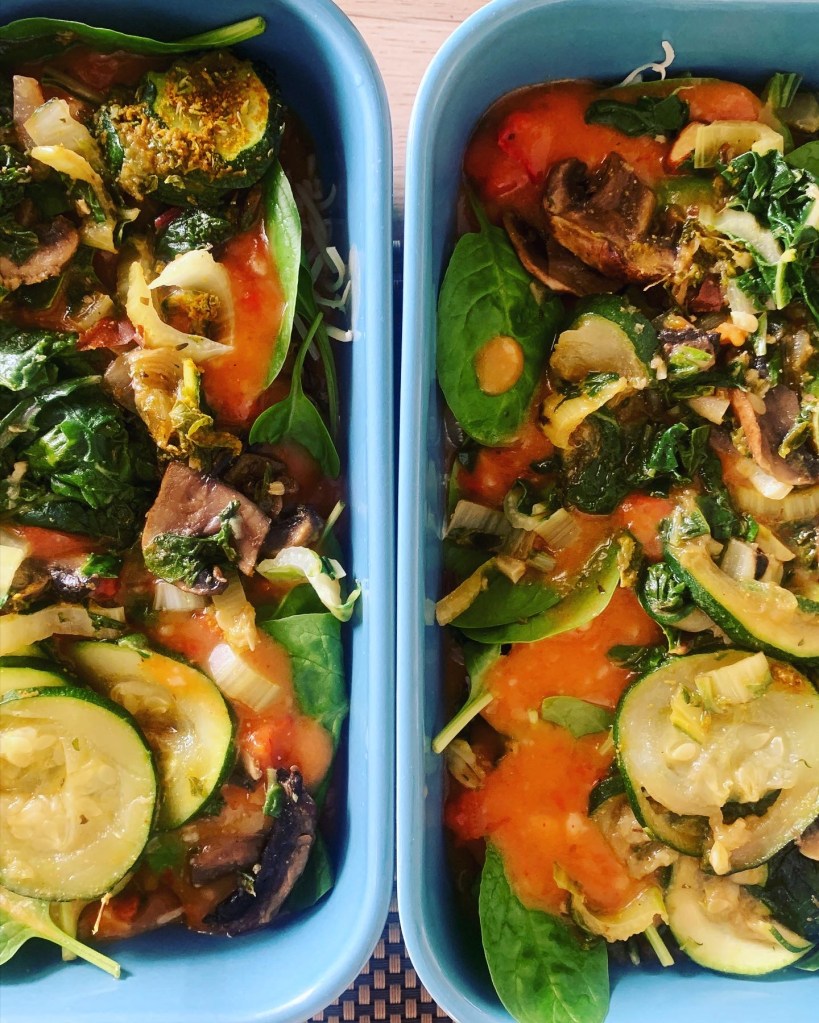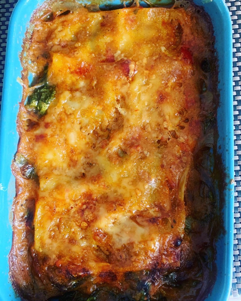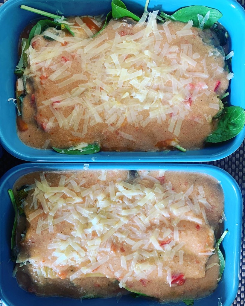 Dans un plat ou 2 petits plats à four, versez un peu de sauce dans le fond, recouvrez de légumes, de comté râpé, puis d’une plaque de lasagne puis d’épinards crus, renouvelez cette opération 1 fois. Terminez par du comté râpé.