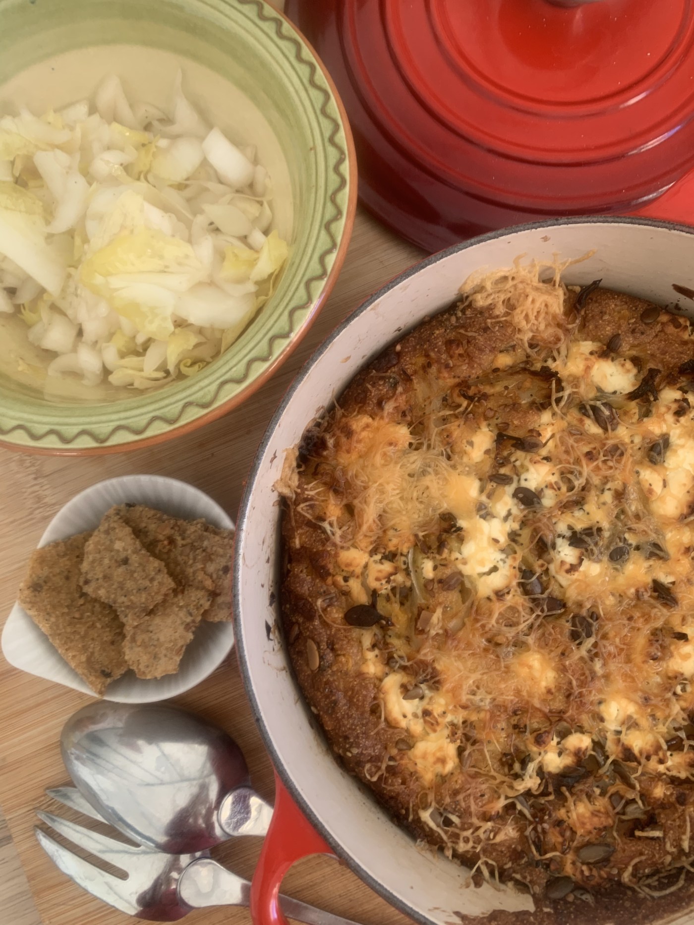 Beurrez un plat en terre cuite ou une cocotte en fonte et versez-y le mélange. Ajoutez sur le dessus la féta émiettée, les oignons émincés et les graines mélangées.