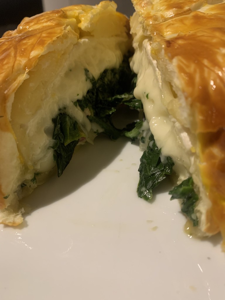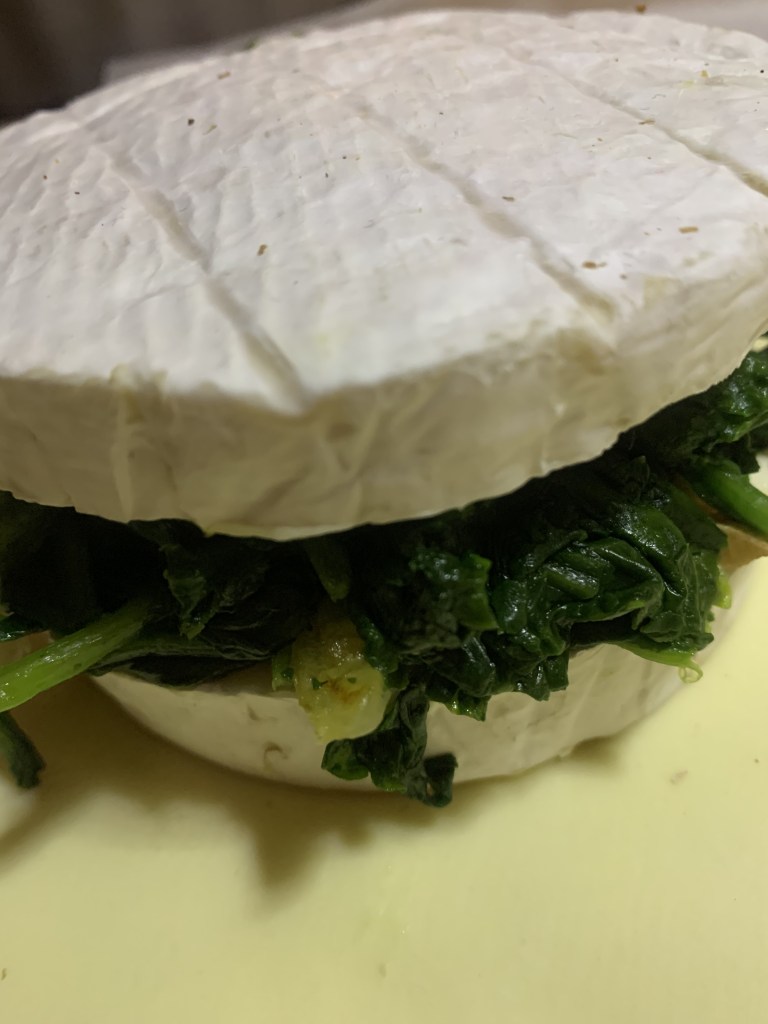 Coupez le camembert dans l’épaisseur ; posez la première moitié sur la pâte feuilletée ; déposez les épinards, les cerneaux de noix, salez, poivrez.