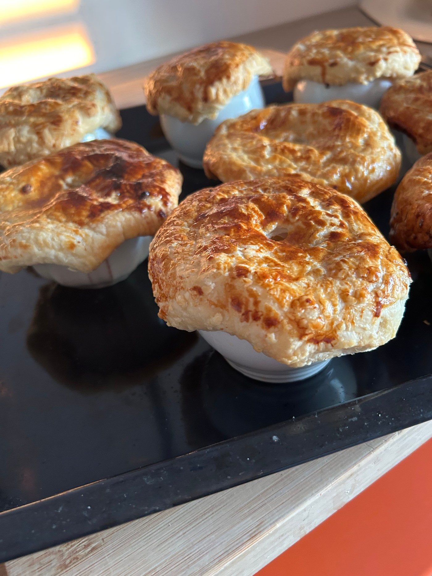 Dans chaque ramequin, ajoutez les cèpes, puis quelques tranches de boudin, versez la sauce puis recouvrez de pâte feuilletée. Rentrez les 4 coins de la pâte et laissez le reste à l’extérieur. Badigeonnez d’un oeuf battu.