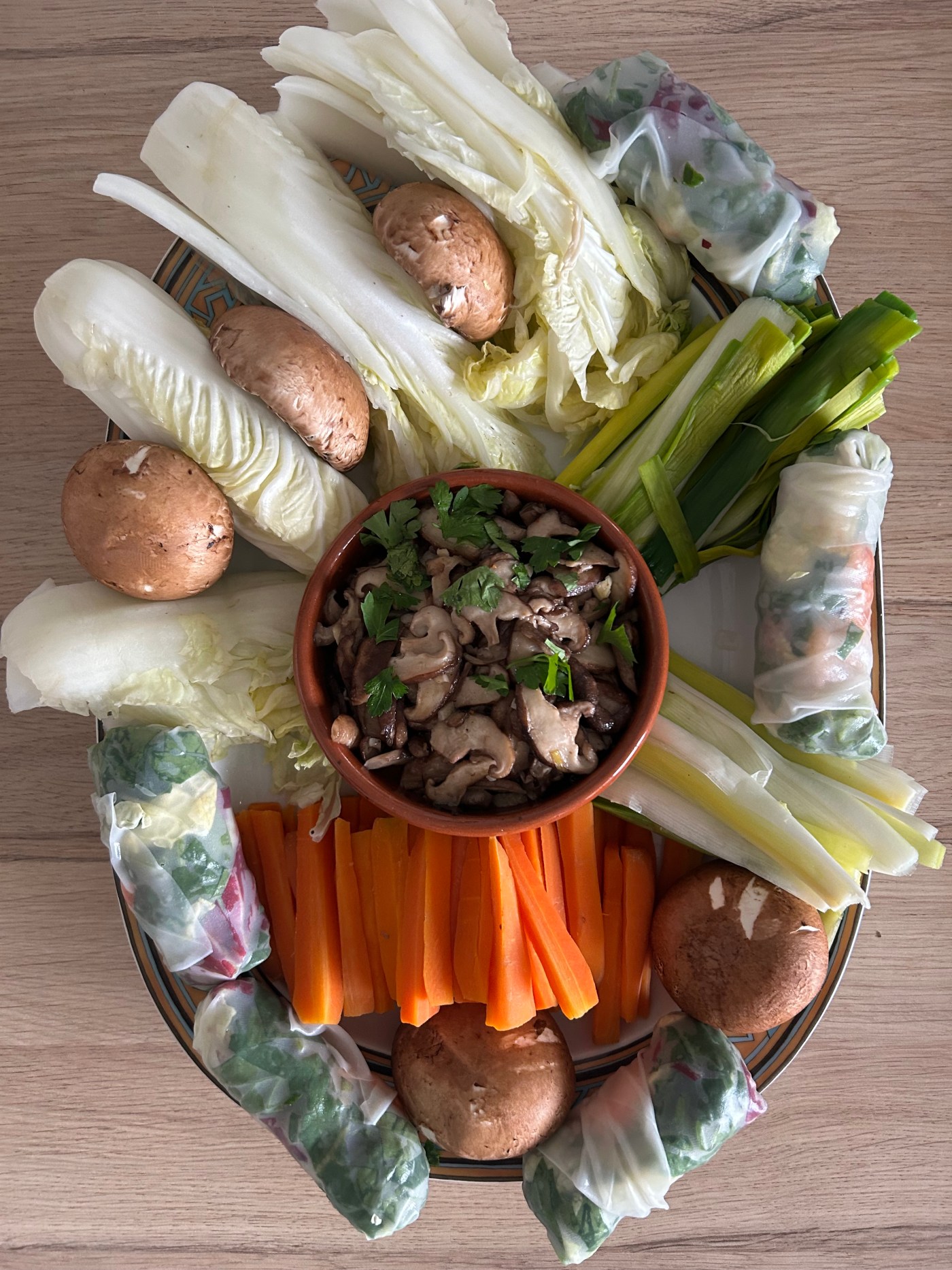 2°- Les légumes : coupez les poireaux en tronçons et les carottes en lamelles. faites-les cuire à la vapeur avec les pak Choï. Retirez le pied sableux des champignons de Paris et coupez-les en 2. Nettoyez les shiitakés. Réalisez des rouleaux de printemps avec le chou chinois émincé.
