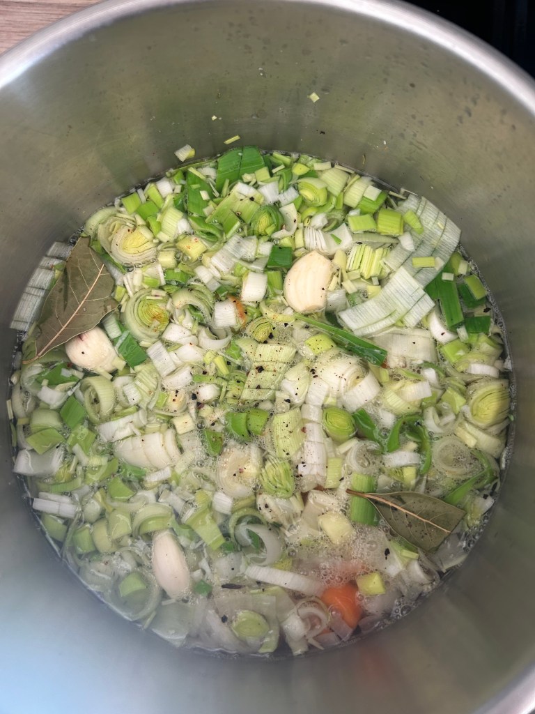 Dans une cocotte, versez les légumes, le laurier et les gousses d’ail, recouvrez d’eau et laissez cuire 20 min. Egouttez et réservez le bouillon.