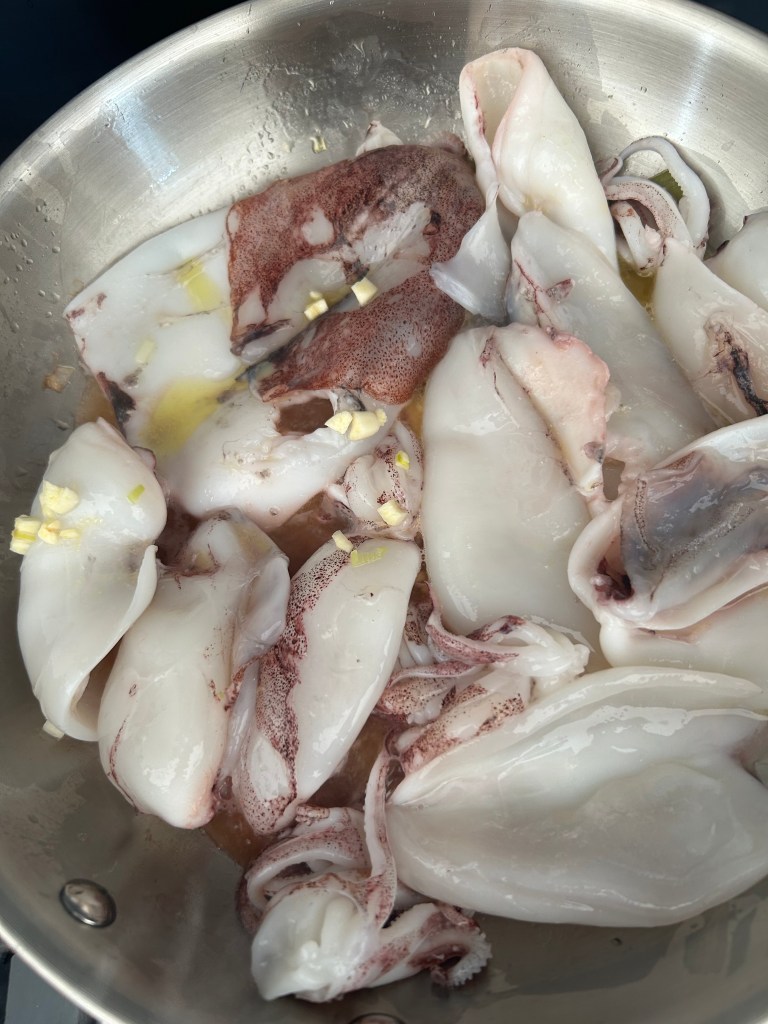 Dans la poêle, versez un peu d’huile d’olive, ajoutez les calamars (que vous aurez nettoyés et coupés). Faites-les revenir en ajoutant la gousse d’ail coupée en petits morceaux. 5 min de cuisson. Versez le contenu de la poêle dans la cocotte.