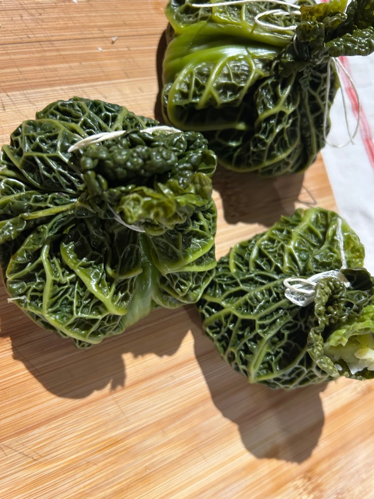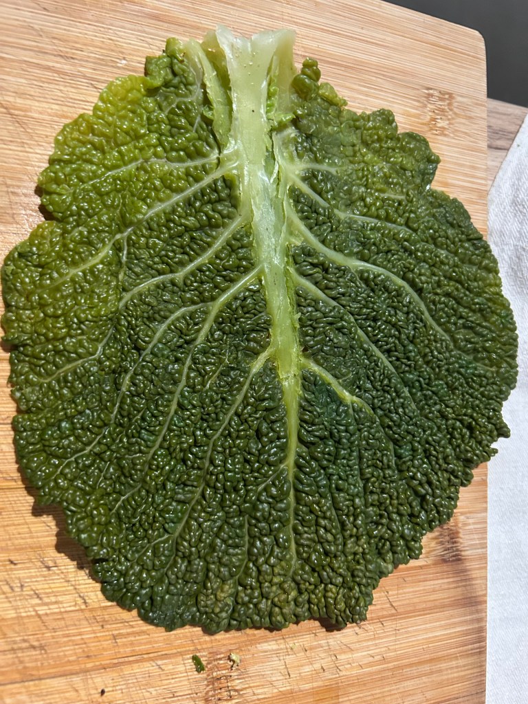 Commencez par détacher les feuilles du chou, lavez-les. Gardez le coeur pour la farce. Faites cuire les grandes feuilles dans le cuit-vapeur pendant 20 mn. Au bout de ce temps, étalez-les sur le plan de travail, posez un torchon par-dessus et avec un rouleau à pâtisserie, aplatissez-les ; réservez.