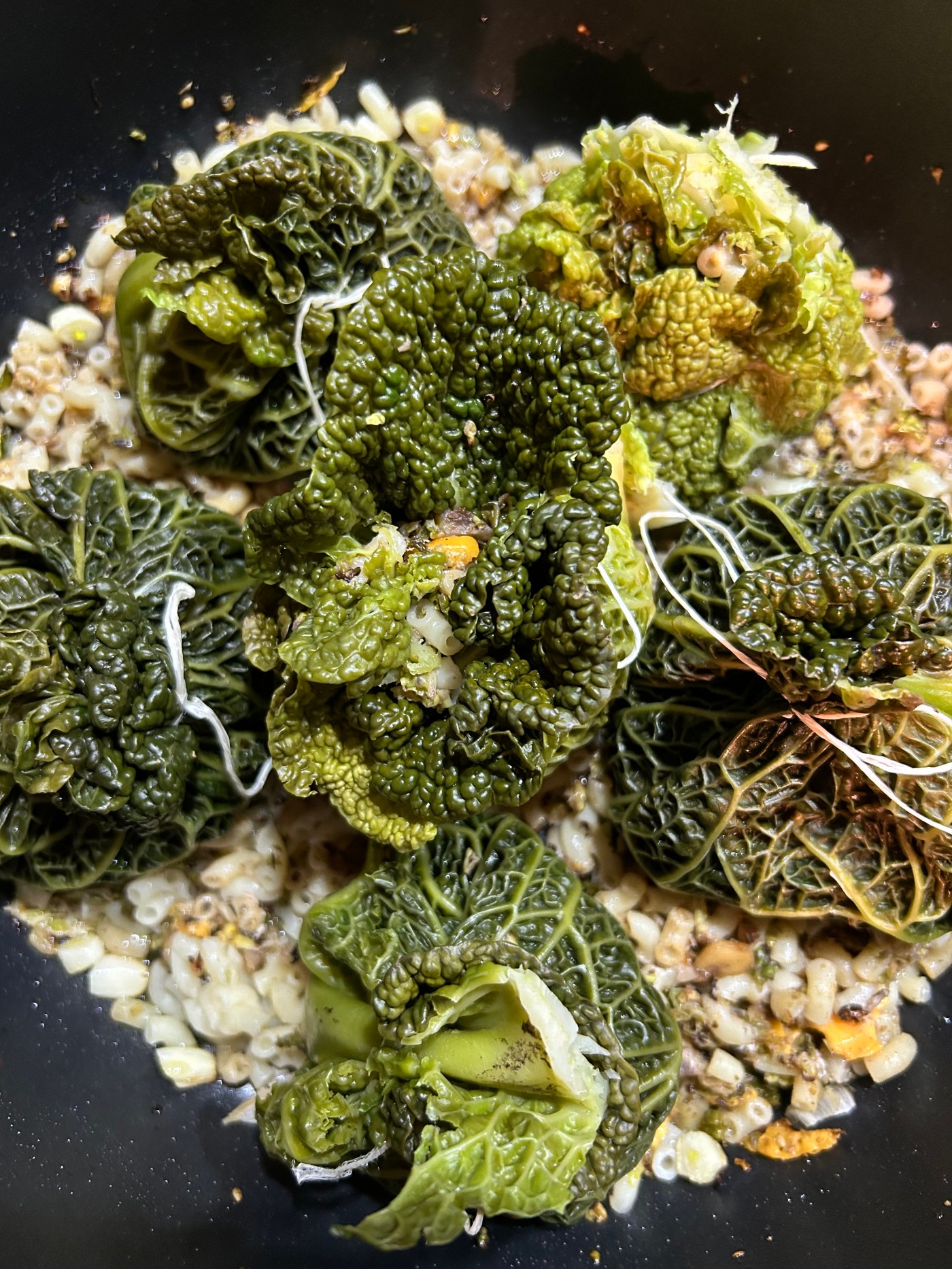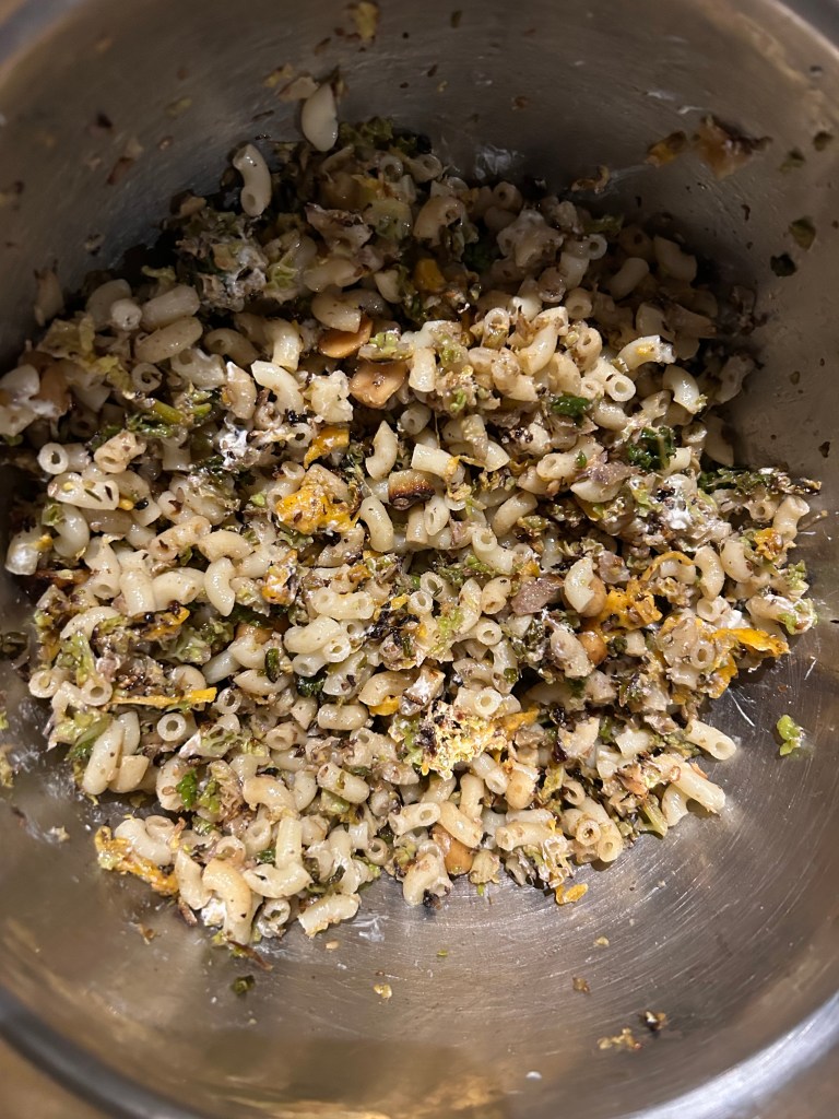 Dans un faitout, faites revenir les gousses d’ail coupées en petits morceaux avec de l’huile d’olive. ajoutez le thym, l’origan, le zaatar, le paprika puis les cacahuètes. Mixez au robot le coeur du chou, versez-le dans le faitout ; laissez mijoter 10 mn. Versez les pâtes.
